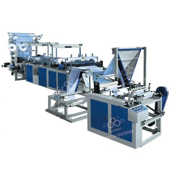 This machine can produce continuous-rolled strip-through type garbage bag, continuous-roll flat bag and normal flat bag.